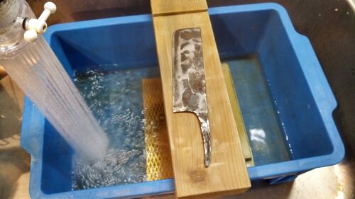 錆々の包丁を預かって修理しています。 kandzume.hatenablog.jp 今日は本格的に研いでいきますよ。 表面をもう少し頑張ってみたけど、この辺までか・・・。 きりがない(笑) 今回は、この縞のところを研ぎ抜きます。 砥石はダイヤモンド砥石400番。 縞の部分…