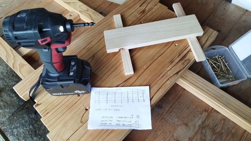 交差した角材が直角になったときに分かりやすいように、一応マーキングしておきました。