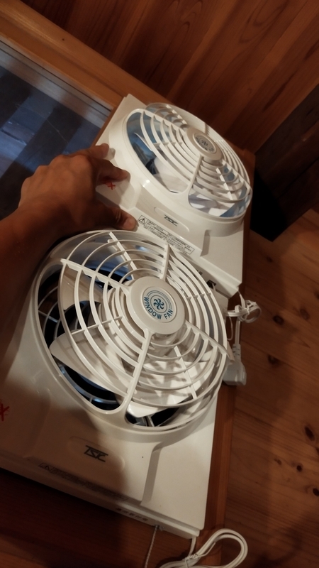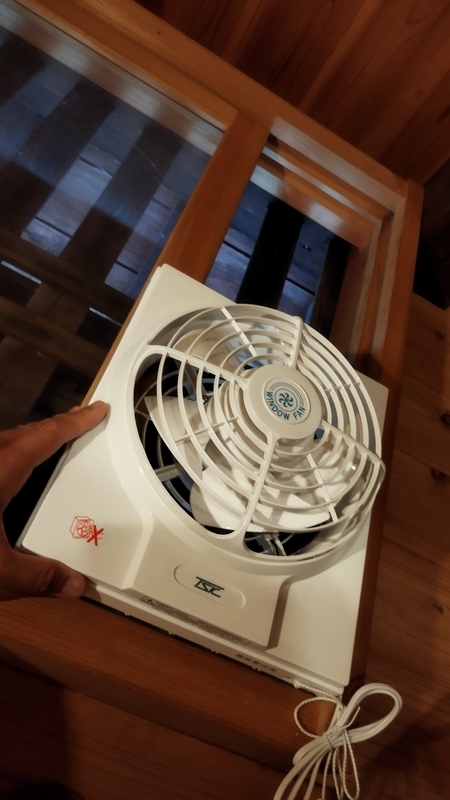 さらに強制的に熱い空気を抜くことを考えるために、あの高窓に窓用換気扇を取り付けることを思い付きました。