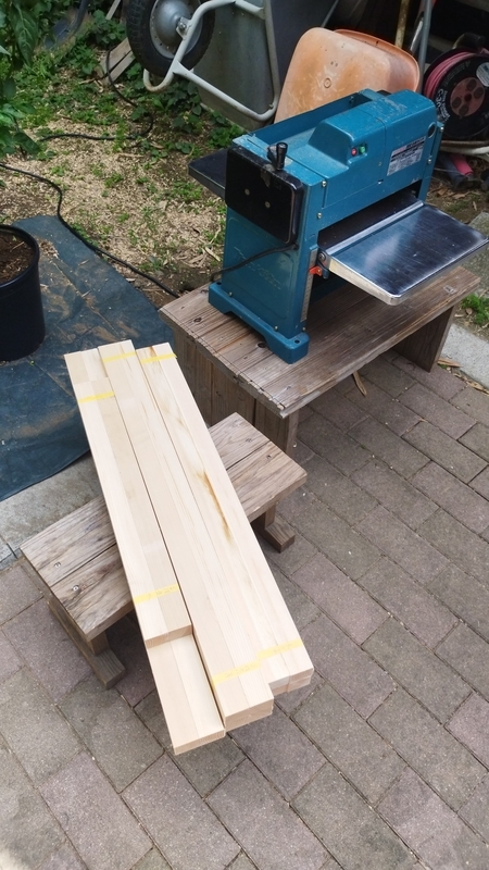 買ってきた木材が表記と若干違ったため、自動鉋に通すことにしました。